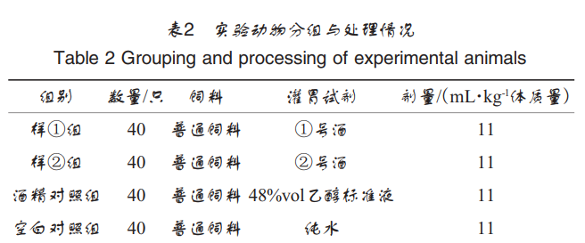 160只Balb/c小鼠適應(yīng)性飼養(yǎng)后,按體質(zhì)量進(jìn)行分層隨 機(jī)分組,分為樣①組、樣②組、酒精對(duì)照組和空白對(duì)照組, 劑量設(shè)置見表2。