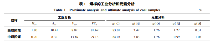 試驗(yàn)所用煤樣有 2 種,分別是取自山西省中南 部沁水盆地的高煤階煤和山西省左權(quán)縣的中煤階 煤。將樣品破碎研磨,過(guò) 0.15 mm( 100 目) 篩,在 45 ℃下干燥 6 h 待用,2 種煤樣的工業(yè)分析和元素分析 結(jié)果見(jiàn)表 1。試驗(yàn)所用菌種由沁水盆地煤層氣田產(chǎn) 出水經(jīng)過(guò)富集得到。試驗(yàn)所用培養(yǎng)基主要包括微量 元素、維 生 素、基 礎(chǔ) 培 養(yǎng) 基 和 半 胱 氨 酸 - 硫 化 鈉 溶液。