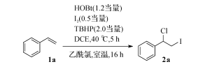 首先筆者采用苯乙烯1a的1-氯-2-碘代反應為 模板反應,對反應條件進行優(yōu)化。苯乙烯與1.2當 量1-羥基苯并三氮唑、0.5當量碘單質,以2當量質 量分數為70%的 TBHP為氧化劑,在二氯乙烷溶劑 中40 ℃下反應5h,隨后與5當量乙酰氯進一步室 溫反應16h,能以45%的收率得到目標產物2a。苯 乙烯1a的1-氯-2-碘代反應過程為在此基礎上篩選氧化劑、溶劑和氯化 試 劑。氧 化劑對反應收率的影響如表1中 序 號1~5所 示。 在沒有氧化劑的情況下,烯烴的1-氯-2-碘代反應不 能進行。對常見的氧化劑進行篩選,發(fā)現過硫酸鉀 和二叔丁基過氧化物對反應沒有作用,雙氧水作氧 化劑目 標 產 物 的 收 率 達 到 29%。因 此,最 終 選 擇 TBHP水溶 液 作 氧 化 劑。