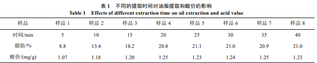 當樣品浸泡在正己烷溶劑中時, 溶解平衡使樣品中 的脂肪含量隨著時間的遞增呈現(xiàn)不同的濃度。因此研究不 同時間段溶劑對樣品脂肪的提取量和樣品脂肪酸價的影響, 對節(jié)省實驗時間具有重大意義。本次實驗分為 8 組, 每組 分別稱取 10 g 樣品于離心管中, 在管中分別加入過量的正 己烷(30 mL)進行震蕩溶解提取, 在 10~45 min 內(nèi)每隔 5 min 測一次酸價和脂肪。最后對測定結(jié)果進行統(tǒng)計分析, 見表 1。 由表 1 可知, 隨著浸泡時間的增加, 溶劑中的脂肪含 量增加速率呈現(xiàn)不同變化, 經(jīng)過分析可以將其變化速率分 為 3 個不同的階段。第 1 階段稱之為快速增長期, 在最初 提取的 15 min 內(nèi)由于濃度梯度差很大, 樣品中的脂肪快速 溶解在正己烷溶劑中。第 2 階段為平緩增長期, 在提取的 15~25 min里, 樣品中的脂肪含量已經(jīng)減少, 濃度梯度差變 小, 脂肪含量雖然也增加, 但增加的速度并沒有最初 1 階 段的速度快。第 3 階段為穩(wěn)定期, 在 25~40 min 的時間段, 脂肪含量并沒有增加, 提取含量達到最大值, 提取效果達 到最大化。酸值的變化與脂肪含量的變化呈現(xiàn)平行增長, 因此提取時間達到 25 min 以上時, 酸值趨于穩(wěn)定, 樣品中 不再有新油脂溶解出來, 脂肪的酸價一直保持穩(wěn)定狀態(tài)。 因此樣品經(jīng)過正己烷溶劑浸泡 25 min 后就可以提取完畢, 同比國標方法的常溫靜置浸提(12 h)縮短 96%的時間, 同 比國標方法的索氏提取法(4 h)縮短 89%的時間, 是一種 高效快速的提取方法。