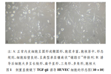 TGFβ1 誘導(dǎo) HUVEC 細(xì)胞 48 h 后,顯微鏡下觀察細(xì)胞形 態(tài)變化,可見(jiàn)誘導(dǎo)后的細(xì)胞呈多角形或梭形,提示內(nèi) 皮間質(zhì)轉(zhuǎn)化模型構(gòu)建成功。見(jiàn)圖 1。