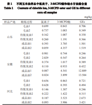 從不同玉米油加工廠取不同批次的毛油、待脫臭油 和成品油,檢測其中氯離子、3-MCPD酯和GEs含量,結 果如表1所示。