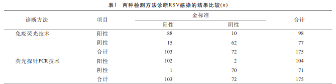 (表1) 175例呼吸道感染患兒中RSV感染陽性103例,其 中男64例,占比62.14%,女39例,占比37.86%。免 疫熒光技術檢測診斷患兒RSV感染陽性98例,其 中真陽性88例,熒光探針PCR技術檢測診斷患兒 RSV感染陽性104例,其中真陽性102例。