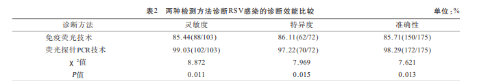 (表2) 免疫熒光技術檢測診斷患兒RSV感染的 靈 敏 度 、 特 異 度 以 及 準 確 性 分 別 為 85.44% 、 86.11%、85.71%。熒光探針PCR技術檢測診斷的 靈 敏 度 、特 異 度 以 及 準 確 性 分 別 為 99.03% 、 97.22%、98.29%,兩者相比熒光探針PCR技術檢 測診斷患兒RSV感染的各項診斷效能均優(yōu)于免 疫熒光技術檢測,差異有統(tǒng)計學意義(P<0.05)。