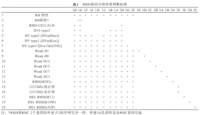 根據(jù)RH基因變異體基因分型檢測試 劑盒,在擴增儀上進行基因分型試驗。將將100μL dNTP-Buffer濃縮液、140μL去離子水 、2.0μL Taq 酶(5units/μL)和 2 5μL樣本DNA共267μL混合 液;向每個引物孔(1~24孔)各加入10μL上述混合 液。擴增循環(huán)參數(shù):96℃ 2 min ,1 cycle ;96℃20 S/68℃60S ,5 cycles; 96℃20 S/65℃50S /72℃45 S,1 0 cycles;9 6℃2 0 S / 6 2℃5 0 S / 7 2℃4 5 S,2 5 cycles; 72℃2min,1 cycle。吸取5μL擴增產(chǎn)物, 加入配制好的2%瓊脂糖凝膠中并進行電泳,電泳參 數(shù)設(shè)置為電壓100V,時間15min。電泳后用凝膠成像 儀進行拍照、記錄與分析?;蚍中偷慕Y(jié)果判斷見表 1。