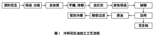原料花生:將原料花生果首先采用剝殼機(jī)去殼; 篩選分級(jí):脫殼后的花生仁通過(guò)初清篩、分級(jí)等過(guò)程。 去雜質(zhì):挑除花生仁中的石子、碎殼、灰塵等雜質(zhì); 干燥、冷卻:將脫殼后的花生放入低溫干燥烘箱進(jìn)行 烘干,然后進(jìn)行風(fēng)冷處理;去紅衣:烘干后的花生仁迅 速進(jìn)入風(fēng)冷并去除紅衣;顏色篩選:去除黃斑、霉變、蟲(chóng)蛀及未完全脫紅衣的花生;破瓣后壓榨:將脫紅衣后 的花生破瓣調(diào)節(jié)水分后送入壓榨機(jī)中進(jìn)行壓榨;原油 過(guò)濾:冷榨毛油經(jīng)過(guò)濾得到純凈的冷榨花生油;密封 冷藏:過(guò)濾后的花生油經(jīng)過(guò)密封后冷藏,待檢測(cè)。