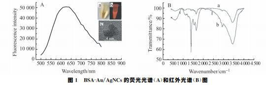 圖1A 為 BSA-Au/AgNCs在激發(fā)波長280nm 處的熒光光譜圖,由圖可見最大發(fā)射波長為625nm。 這些熒光特征與報道的基本一致,表明實驗已經(jīng)成功合成了 BSA-Au/AgNCs。日 光 下 制 備 的 BSA-Au/AgNCs呈棕黃色(如圖1A 插圖a),而在365nm 的紫外燈下顯示出很強的橘紅色熒光,如圖1 插圖b所示。 圖1 BSA-Au/AgNCs的熒光光譜(A)和紅外光譜(B)圖 Fig.1 Fluorescencespectra(A)andIRspectra(B)ofBSA-Au/AgNCs InsetainFig.A:ImageofBSA-Au/AgNCsunderthedaylightlamp;Insetb:ImageofBSA-Au/AgNCsunder365nm UVlight; Insetc:HRTEMimageofBSA-Au/AgNCs. 利用高分辨透射電鏡(HRTEM)研究了合成的 BSA-Au/AgNCs的尺寸。如圖1插圖c所示,可以觀 察到合成的 BSA-Au/AgNCs尺寸約4nm,表明 BSA-Au/AgNCs具有高度結晶的結構。利用紅外光譜 表征了 BSA-Au/AgNCs的結構信息,結果如圖1B所示。其中曲線a為 BSA-Au/AgNCs的紅外譜,曲線 b為 BSA 的紅外光譜。與 BSA 的紅外光譜相比,BSA-Au/AgNCs的紅外光譜在1654cm-1的特征吸收 峰有較為明顯的減弱,這表明反應后蛋白質的α 螺旋結構減少了,蛋白質的二級結構發(fā)生了改變,同時在 蛋白質中巰基與 Au、Ag形成共價鍵。