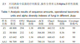 香農(nóng)(Shannon)指數(shù)、ACE指數(shù)、Chaol指數(shù)、辛普森 (Simpson)指數(shù)和Coverage指數(shù)是常用于描述微生物群落 物種多樣性的Alpha多樣性指數(shù),這5個多樣性指數(shù)可以對 群落物種組成的豐富度及群落物種組成的均勻度進行綜 合性的評價,5個多樣性指數(shù)中的Shannon指數(shù)對微生物群 落物種多樣性更為敏感。其中,Shannon指數(shù)越大,群落物 種的多樣性越高;Chaol指數(shù)或ACE指數(shù)越大表明群落物 種豐富度越高;由Coverage指數(shù)可知本次實驗的取樣是否 合理,若Coverage指數(shù)>97%,則證明本次取樣是合理的;但Simpson指數(shù)值越大,說明群落多樣性越低。基于高通 量測序技術(shù)對濃香型白酒中高溫曲和芝麻香型白酒高溫 曲中真菌的序列數(shù)量、操作分類單元(operational taxonomic units,OTU)和Alpha多樣性指數(shù)進行研究,結(jié)果見表1。