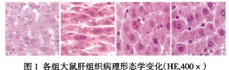 取血后 , 即 刻取出 肝臟 , 取 部分肝組織用 1 0 %甲 醛 固定 , 常規(guī)石蠟包埋 切片 , HE 染色 , 光學顯微鏡下觀察 。