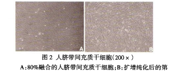 經(jīng)醫(yī)院 醫(yī)學倫理委員會 批準。 經(jīng)過產(chǎn)婦知 情同 意后 , 采集正常 足 月 剖宮產(chǎn) 健康胎兒臍帶組織 , 置人 Ha nk ’ s 液 , 4 尤保存 。 在 超凈 臺 內(nèi) 取 出 胳帶 , 用 PB S 沖洗血液 , 用 手術(shù) 刀剔 除胳 帶 內(nèi)血管 , 將臍帶剪成 1  ̄ 2 _3 組織塊 , 放 人培養(yǎng)瓶 , 加人 I I 型 膠原酶消 化 , 過濾 、 收集 細胞 , 接種在 6 孔板內(nèi) , 置于 C 02 培養(yǎng)箱 內(nèi) 培 養(yǎng)。 96 h 后半量更 換培養(yǎng)液 , 以 后 隔 半天半量換 液 , 顯微鏡 下 觀察 , 大約 1 0 d 后 , 細 胞融合達到 8 0 %時 , 進行 傳 代培 養(yǎng)。