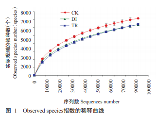 共測序獲得886890個序列,在97%的相似水平 下聚類后獲得61660個OTUs。測序結果顯示,3個樣品的所有優(yōu)質序列經聚類注釋后歸屬于40個菌門。 從圖1可看出,當測序深度達80000個序列時,各處理 的Observed species指數(shù)曲線趨向平緩,上升速度減 緩,說明測序深度已基本覆蓋樣品中絕大部分物種; 在同等測序深度上,無發(fā)病現(xiàn)象的CK處理實際觀測 到的物種數(shù)最多,當測序深度達70000個序列時,接 種致病菌的DI處理實際觀察到的物種數(shù)低于CK處 理、高于TR處理,隨測序深度的加大,接種生防菌的 TR處理其實際觀測到的物種數(shù)略高于DI處理、低于 CK處理。